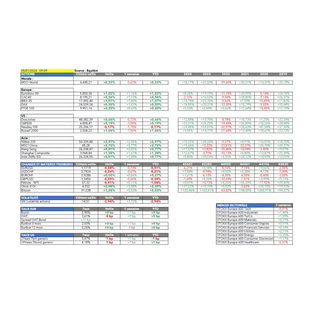 FLASH marchés du 20 janvier 2026 | Actualités Chers tous, Vous conviendrez qu’il est pénible de se réveiller tous les matins en se demandant ce que Trump nous a encore sorti pendant la nuit. Ça n’arrête pas, c’en est pénible d’être en permanence malmenés. Guerre commerciale avec l’Europe. On a longtemps pensé...
